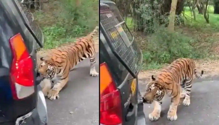 পর্যটক বোঝাই গাড়ি টেনে নিয়ে যাচ্ছে বাঘ, ভিডিও দেখলে চোখ উঠবে কপালে