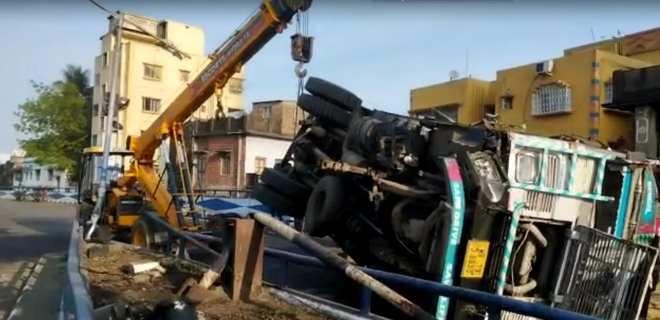 সাত সকালে কোনা রোডে দুর্ঘটনা, উলটে গেল বালি বোঝাই লরি