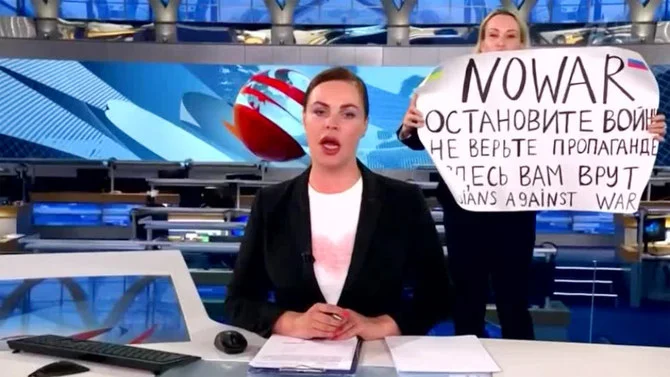 রুশ টিভিতে লাইভে ঢুকে যুদ্ধবিরোধী স্লোগান মহিলার