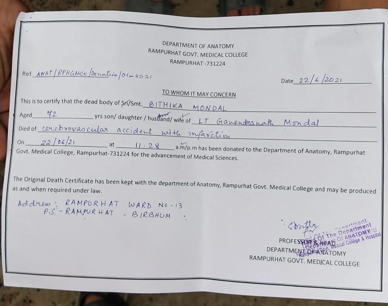 মরণোত্তর দেহ দান রামপুরহাট মেডিক্যাল কলেজ হাসপাতালে