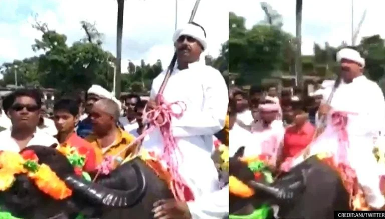 পেট্রোপণ্যের মূল্য বৃদ্ধির প্রতিবাদ, মোষের পিঠে চড়ে মনোনয়ন জ...